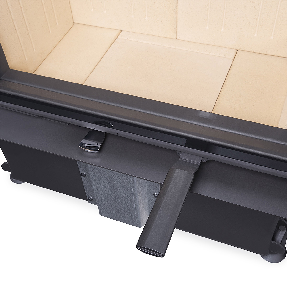 IMPRESSION fireplace inserts have unusually high glass windows, offering a luxurious view of the fire. Double glazing in the specially rigid profile of the door frame allows these fireplace inserts to be used for accumulation and convection operation. The easy, silent and precise operation of the lifting door is guaranteed by the state-of-the-art SILENT LIFT system. The lifting door is operated using a removable handle, which can optionally be replaced by a fixed handle. The combustion chamber is available in black or cream colour with an optional change for the furnace grate. The innovative DOUBLE SPIN flue gas system increases efficiency and reduces the environmental impact of the fireplace insert. Secondary air intake washes over the glass in the door to prevent the cumulation of deposits. Primary and secondary air intake is regulated by a single control element. Fireplace inserts are equipped with a EAI (external air intake), which can be easily connected using the AIRBOX rotating elbow. The flue gas exhaust can be connected from the side or the top. Side and top MAMMOTH accumulation sets can be purchased separately for fireplace inserts, which can extend the period of heat radiation by more than 12 hours.